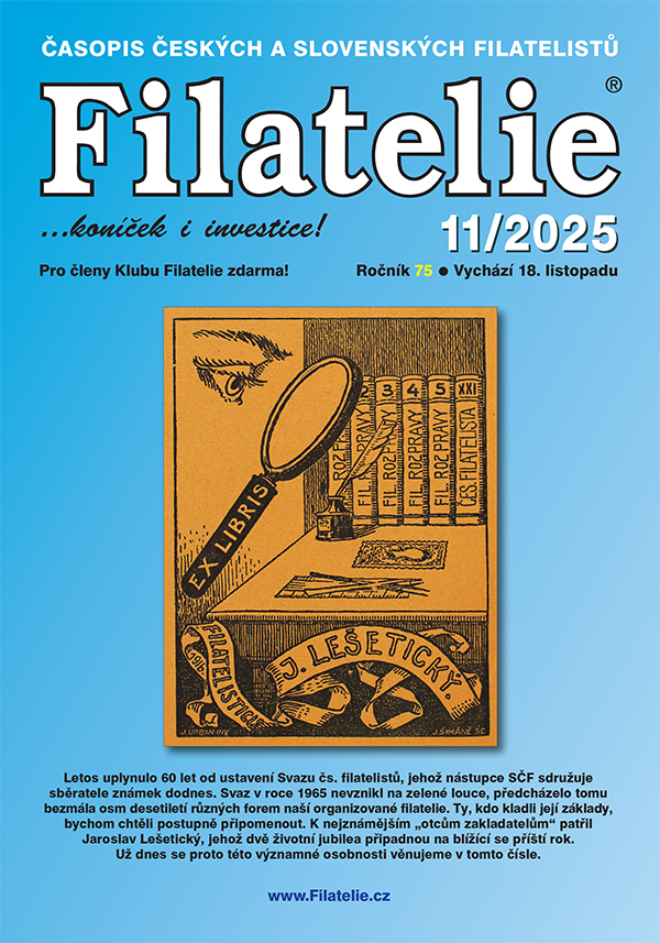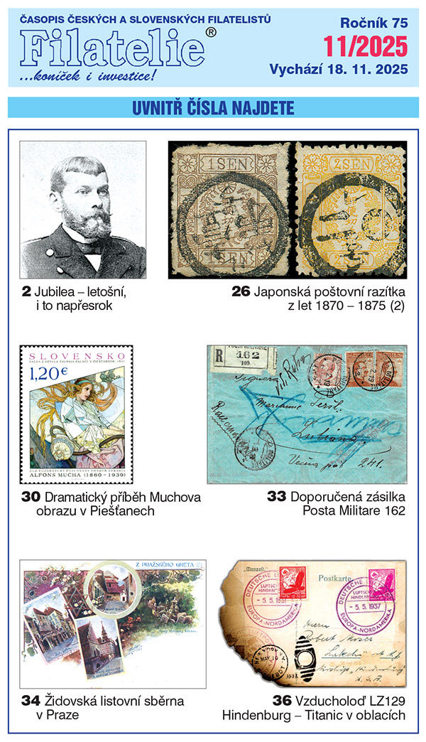 Úvodní článek Filatelie č. 11 připomněl blížící se jubileum významného českého sběratele a filatelistického publicisty Jaroslava Lešetického. V časopisu je otištěna zevrubná vzpomínka na něj, kterou před lety napsal jiný významný sběratel Václav Nebeský. Tento text je doplněn řadou ilustrací a komentářem ze současného úhlu pohledu. Druhou částí článku z geograficky vzdálené oblasti je dokončena upoutávka na zajímavá japonská poštovní razítka z let 1870-1875. Jiný příspěvek s téměř detektivním námětem nás vrací jen o několik málo let zpátky, kdy ve slovenských Piešťanech byl odcizen obraz Alfonse Muchy, a jak se tato událost odrazila ve filatelii u našich sousedů. Další dramaticky laděný příběh včetně ukázky filatelistického dokladu připomíná havárii vzducholodi LZ129 Hindenburg. V tomto čísle časopisu naleznete i další příspěvky ze světa poštovní historie nebo vyprávění týkající se oblíbených tvůrců našich poštovních známek, manželů Knotkových. A možná čtenáře zaujme i několik kratších příspěvků z Listárny.