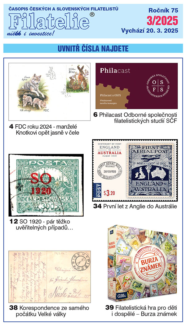 Filatelie č. 3 informuje o činnosti Odborné společnosti filatelistických studií SČF. Zajímavou novinkou v její činnosti je příprava videí s filatelistickými přednáškami nebo informacemi o našem oboru obecně. Tato videa, nazývaná Philacasty, jsou umísťována na web a každý je může kdykoli shlédnout. Společnost se rovněž angažuje v podpoře vydávání filatelistické literatury v klasické tištěné podobě. Zajímavým příspěvkem v tomto čísle časopisu je i filatelistická dokumentace prvního letu z Anglie do Austrálie na přelomu let 1919 a 1920. Znalecká hlídka se tentokrát věnuje několika padělkům, u kterých padělatelé ve snaze vydělat pár stokorun zničili z neznalosti řádově mnohem dražší známky. Kromě dalších příspěvků zde můžete opět nalézt Listárnu reagující na příspěvky čtenářů. Přílohou časopisu je i druhé pokračování katalogu celin České republiky.