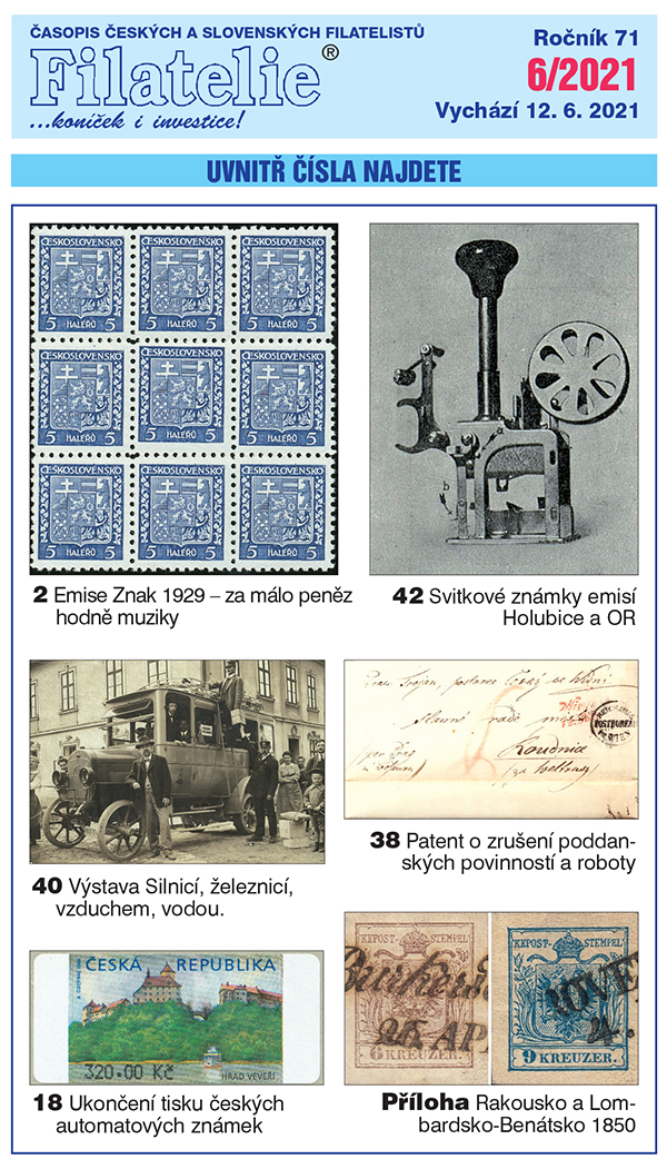 Stěžejním článkem čísla 6/2021 časopisu Filatelie je studie dosud nepříliš oblíbené výplatní emise Státní znak z roku 1929. Jak napovídá titulek „… za málo peněz hodně muziky“, jde o poměrně levný a relativně dostupný materiál, ve kterém lze při hlubším studiu nalézt leccos zajímavého, a dokonce je možné vytvořit kvalitní 80listový exponát, za který jeho autor vloni získal vysoké ocenění v podobě zlaté medaile a 90 bodů. Období první republiky se věnuje i další článek, který připomíná téměř zapomenuté „provizorní“ vydání svitkových známek už v roce 1922, které po vzoru sousedních zemí bylo zřejmě iniciováno prodejci frankovacích strojků. Zajímavá je rovněž souvislost těchto svitkových známek s používáním firemních perfinů. Specializaci známek ČSR II se věnuje už 18. pokračování přehledu dosud nepublikovaných deskových vad. Období České republiky tentokrát zastupuje příspěvek o skončení tisku a vydávání automatových známek, jejichž používání se u nás příliš nerozšířilo. Článek ovšem upozorňuje na řadu zajímavostí s tím souvisejících a je příslibem uveřejnění podrobnější studie této dílčí a zároveň už uzavřené kapitoly naší filatelie. I v tomto čísle naleznete řadu dalších příspěvků a nechybí ani pokračování specializované příručky věnované prvním rakouským a potažmo tedy i našim poštovním známkám vydání z roku 1850, jejíž otiskování se už pomalu chýlí ke konci.