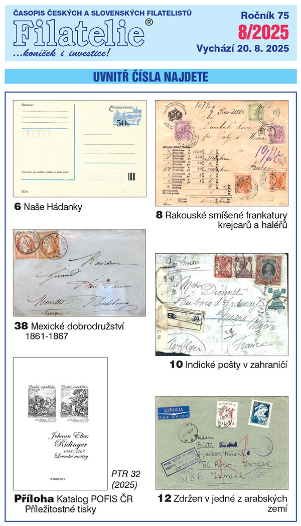 Několik příspěvků Filatelie č. 8 je zaměřeno na poštovní provoz v zahraničí. Jeden příspěvek je věnován působení českých vojáků v Mexiku v letech 1861-67 v rámci rakousko-uherských sborů. Další popisuje různá zastoupení indické pošty v řadě zemí světa v různých dobách. Jiný příspěvek popisuje bloudění jednoho dopisu z Polska do Izraele. K našemu území se vztahuje popis celistvostí se smíšenými frankaturami rakouských známek krejcarové a haléřové měny v roce 1900. Krátká ukázka představuje překvapivou novinku v tematické filatelii – jednolistové exponáty. Přílohová část přináší druhé pokračování aktualizovaného katalogu příležitostných tisků České republiky. Druhou přílohou jsou Informace SČF vydané krátce před Valnou hromadou.